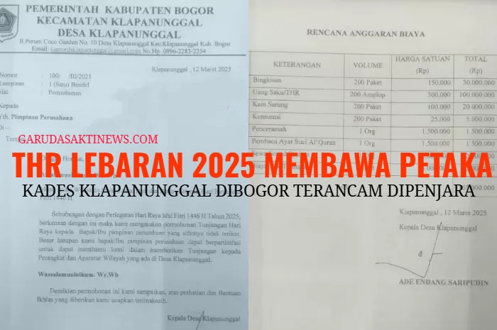 GARUDASAKTINEWS.COM-Kepala Desa (Kades) Klapanunggal, Ade Endang Saripudin, meminta maaf atas surat edaran tentang meminta uang tunjangan hari raya (THR) kepada pengusaha. Ade tertangkap bukti meminta uang THR sebesar Rp165 juta melalui selebaran kepada perusahaan dan pabrik di wilayah Klapanunggal, Kabupaten Bogor, Jawa Barat (Jabar).