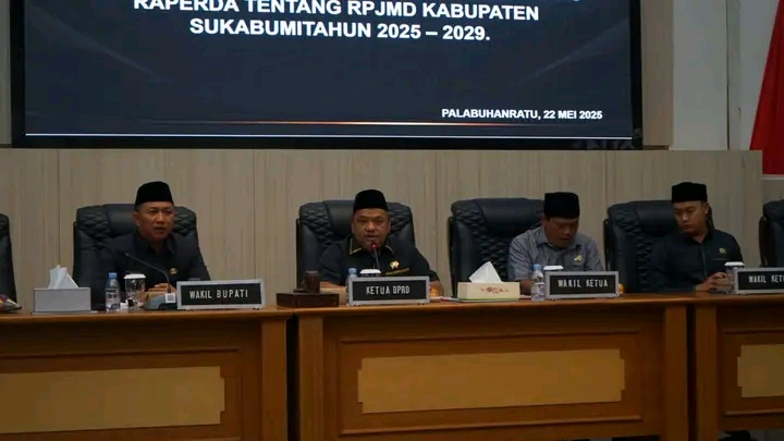 Garudasaktinews.com sukabumi- Wakil Bupati Sukabumi H Andreas mewakili Bupati H Asep Japar menghadiri Rapat Paripurna DPRD Kabupaten Sukabumi agenda penyampaian pandangan umum fraksi-fraksi DPRD terhadap nota pengantar Bupati atas Raperda tentang RPJMD kabupaten Sukabumi Tahun 2025-2029. Paripurna berlangsung di ruang rapat DPRD Kabupaten Sukabumi, Kamis (22/5/2025).