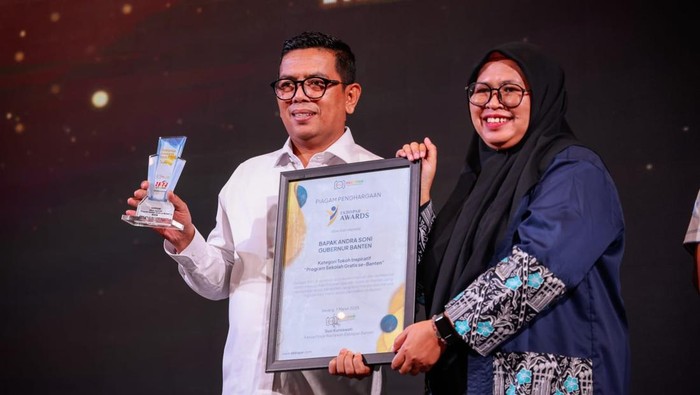 GARUDASAKTINEWS.COM-Perdana, Bertempat di Ballroom Aston Serang Hotel & Convention Center, Kelompok Kerja (Pokja) Ekonomi, Bisnis dan Pariwisata (Ekbispar) Provinsi Banten menganugrahi Gubenur Banten Andra Soni sebagai Tokoh Inspiratif atas Program Sekolah Gratis se-Banten  melalui Anugerah Ekbispar Award 2025 pada Jumat (7/3/2025).Selain itu, sebagai Gubenur Andra Soni juga menerima penghargaan untuk kategori Instansi Pemerintah.