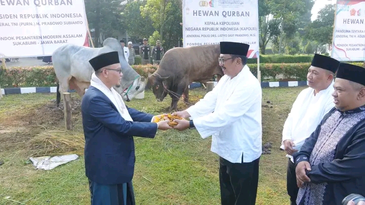 Dalam kegiatan tersebut, dilaksanakan penyerahan hewan kurban bantuan presiden dan sembako oleh pimpinan daerah Kabupaten Sukabumi