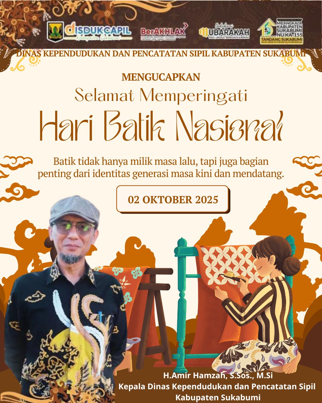 Dinas Kependudukan dan Pencatatan Sipil Kabupaten Sukabumi Mengucapkan Selamat Hari Batik Nasional 2025GARUDA SAKTI NEWS02/10/202521/10/2025Berita, SUKABUMI25864 Views Post Views: 25,864 Related PostsKepala Disdukcapil Hadiri Rapat Dinas, Teken Kerja Sama Strategis dan Dukung Penguatan Layanan Kependudukan TerintegrasiDinas Dukcapil Kabupaten Sukabumi Luncurkan “PAK CAMAT” untuk Pelayanan Administrasi Kependudukan yang Lebih Mudah dan CepatKepala Dinas Dukcapil Kab. Sukabumi H.Amir Hamzah Menghimbau Agar Masyarakat Berhati-hati Terhadap Penipuan Yang Berkedok DukcapilDon't MissDisdukcapil Sukabumi Buka Layanan Adminduk di Tiga Titik Saat Touring Ngabumi & Geopark Fun Rally 2025Polres Sukabumi Gelar Apel Kesiapan Tanggap Darurat Bencana di PalabuhanratuAl Umanaa Jadi Rujukan Nasional, BI Sulawesi Tenggara Studi Tiru Ekonomi Syariah dan Kemandirian PesantrenPEMDES Sukamaju Kec. Cikakak Gelar Gotong Royong Perbaiki Irigasi Ciodeng Pasir Badak, Perkuat Kepedulian dan Kekompakan WargaPEMKAB. Sukabumi Tata Ulang Geopark Information Center untuk Perkuat Daya Tarik Wisata DuniaDLH Kabupaten Sukabumi Dampingi Wabup Tinjau Lokasi Pasca Bencana di Cisolok : Pastikan Penanganan Lingkungan Berkelanjutan