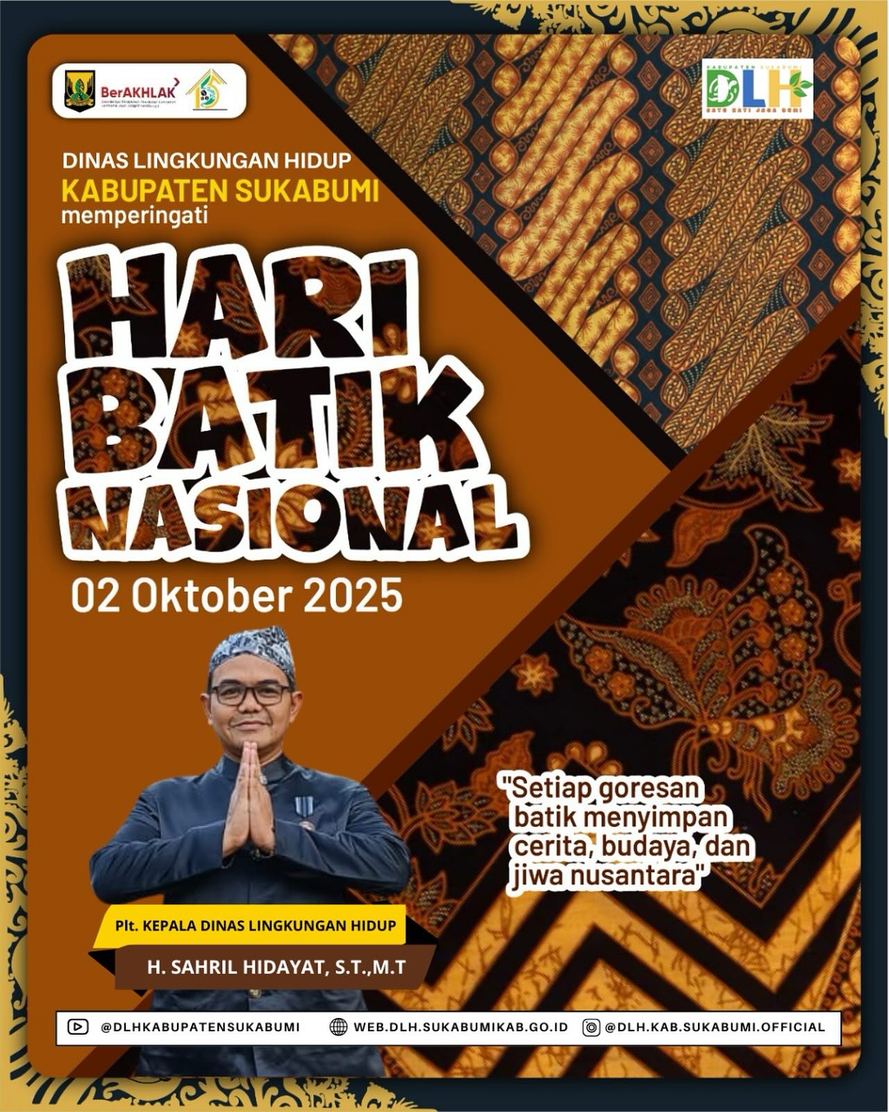 Dinas Lingkungan Hidup Kabupaten Sukabumi Mengucapkan Selamat Hari Batik Nasional 2025GARUDA SAKTI NEWS02/10/202526/10/2025Berita, SUKABUMI20533 Views Post Views: 20,533 Related PostsWarga Desa Cikahuripan Kecamatan Cisolok Sukabumi Apresiasi DLH Kabupaten Sukabumi yang Cepat Tanggap Tangani Dampak BanjirDinas Lingkungan Hidup Kabupaten Sukabumi Mengucapkan Selamat Hari Santri Nasional 2025Ucapan Keluarga besar Dinas Lingkungan Hidup Kabupaten SukabumiTPA Cimenteng Terima Kunjungan Edukatif dari SD Alam Indonesia Sukabumi: DLH Dampingi Kegiatan Outing Bertema LingkunganDinas Lingkungan Hidup Kabupaten Sukabumi Lakukan Verifikasi Lapangan Penilaian Sekolah Adiwiyata 2025Dinas Lingkungan Hidup Kabupaten Sukabumi Mengucapkan Selamat HUT TNI Ke 80Dinas Lingkungan Hidup Kabupaten Sukabumi Mengucapkan Selamat Hari Kesaktian Pancasila 2025DLH Kabupaten Sukabumi Mengajak Seluruh Masyarakat Untuk Memberikan Dukungan Penuh Kepada Winie Zenab Nurkhasanah, Ini Cara Tutorial Votenya..!!Don't MissDisdukcapil Sukabumi Buka Layanan Adminduk di Tiga Titik Saat Touring Ngabumi & Geopark Fun Rally 2025Polres Sukabumi Gelar Apel Kesiapan Tanggap Darurat Bencana di PalabuhanratuAl Umanaa Jadi Rujukan Nasional, BI Sulawesi Tenggara Studi Tiru Ekonomi Syariah dan Kemandirian PesantrenPEMDES Sukamaju Kec. Cikakak Gelar Gotong Royong Perbaiki Irigasi Ciodeng Pasir Badak, Perkuat Kepedulian dan Kekompakan WargaPEMKAB. Sukabumi Tata Ulang Geopark Information Center untuk Perkuat Daya Tarik Wisata DuniaDLH Kabupaten Sukabumi Dampingi Wabup Tinjau Lokasi Pasca Bencana di Cisolok : Pastikan Penanganan Lingkungan Berkelanjutan