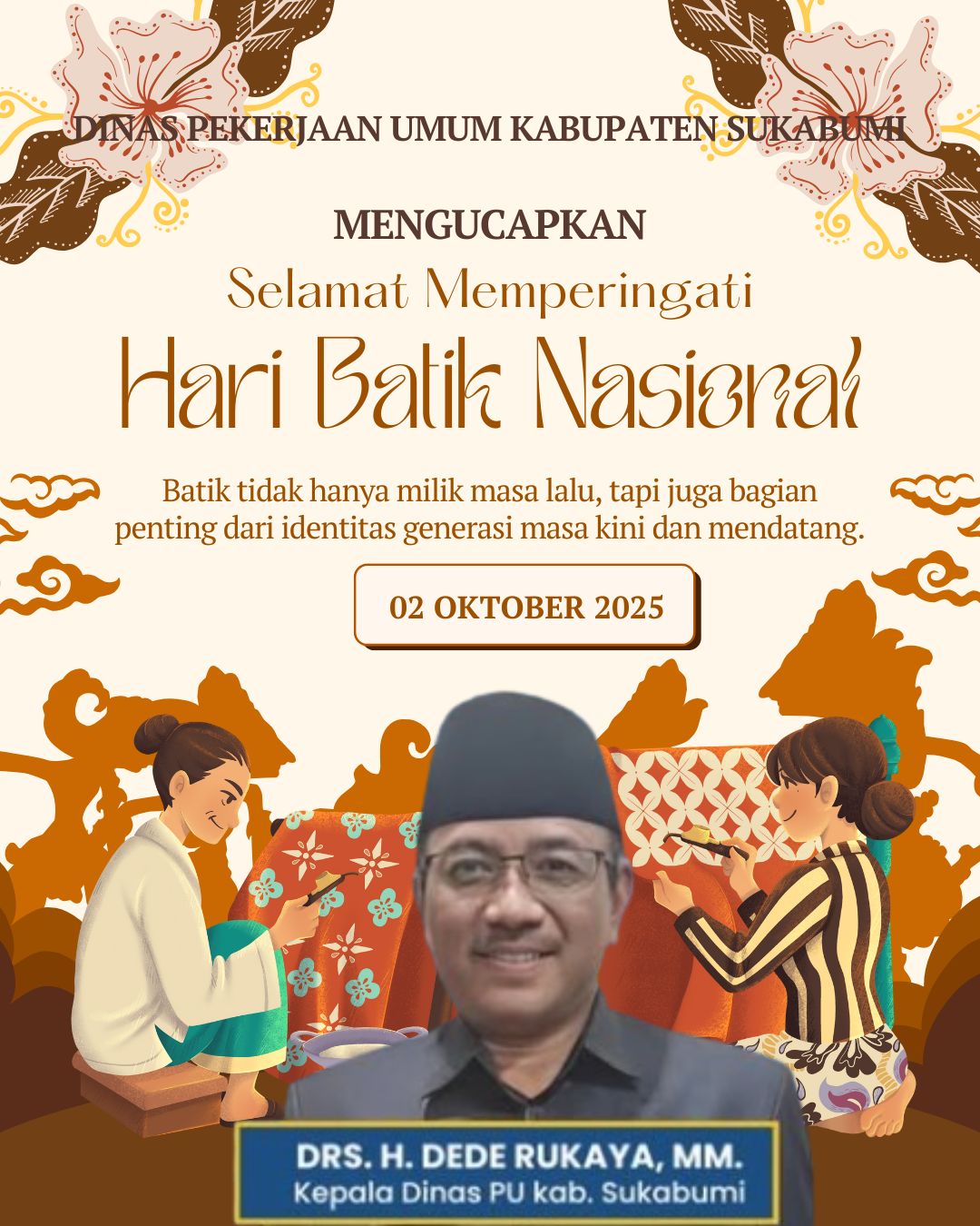 Dinas PU Kabupaten Sukabumi Mengucapkan Selamat Hari Batik Nasional 2025GARUDA SAKTI NEWS02/10/202521/10/2025Berita, SUKABUMI25865 Views Post Views: 25,865 Related PostsDinas PU Kabupaten Sukabumi Fokus Tuntaskan Ruas Jalan Parungkuda–Bojongpari Tahun 2026Dinas PU Kabupaten Sukabumi Rekonstruksi Ruas Jalan Nagrak–Cibadak dengan Konstruksi Beton SemenBendungan Leuwi Bangga Selesai Diperbaiki, Warga Tiga Desa Akhirnya Kembali Nikmati Air Bersih dan IrigasiBupati Sukabumi Lantik 293 Pejabat, Uus Pirdaus Resmi Jabat Kepala Dinas PUDinas Pu Kabupaten Sukabumi Mengucapkan Selamat Hari POS Sedunia 2025Bendungan Leuwi Bangga Rampung Diperbaiki, Warga Cibadak Akhirnya Terbebas dari Krisis AirDinas Pu Kab. Sukabumi Mengucapkan Dirgahayu ke-80 tahun Tentara Nasional IndonesiaDinas PU Kabupaten Sukabumi Tingkatkan Jaringan Irigasi di Cikembar untuk Dukung Ketahanan PanganDon't MissDisdukcapil Sukabumi Buka Layanan Adminduk di Tiga Titik Saat Touring Ngabumi & Geopark Fun Rally 2025Polres Sukabumi Gelar Apel Kesiapan Tanggap Darurat Bencana di PalabuhanratuAl Umanaa Jadi Rujukan Nasional, BI Sulawesi Tenggara Studi Tiru Ekonomi Syariah dan Kemandirian PesantrenPEMDES Sukamaju Kec. Cikakak Gelar Gotong Royong Perbaiki Irigasi Ciodeng Pasir Badak, Perkuat Kepedulian dan Kekompakan WargaPEMKAB. Sukabumi Tata Ulang Geopark Information Center untuk Perkuat Daya Tarik Wisata DuniaDLH Kabupaten Sukabumi Dampingi Wabup Tinjau Lokasi Pasca Bencana di Cisolok : Pastikan Penanganan Lingkungan Berkelanjutan