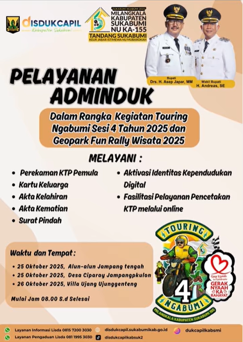 Dalam rangka mendukung kegiatan Touring Ngabumi Sesi 4 dan Geopark Fun Rally Wisata 2025, Dinas Kependudukan dan Pencatatan Sipil (Disdukcapil) Kabupaten Sukabumi kembali menghadirkan pelayanan administrasi kependudukan (adminduk) langsung di tengah masyarakat.
