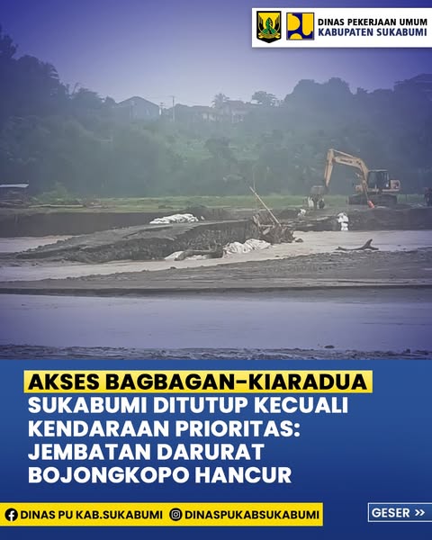 garudasaktinews.com – Sukabumi, Kementerian Pekerjaan Umum dan Perumahan Rakyat (PUPR) melalui PJN 2.3 Provinsi Jawa Barat resmi menutup akses jalan nasional ruas Bagbagan–Kiaradua di Kabupaten Sukabumi, mulai Senin (14/4/2025). Penutupan ini dilakukan menyusul hancurnya jembatan darurat yang dibangun sebagai jalur sementara selama proses perbaikan Jembatan Cidadap yang sebelumnya amblas diterjang banjir.