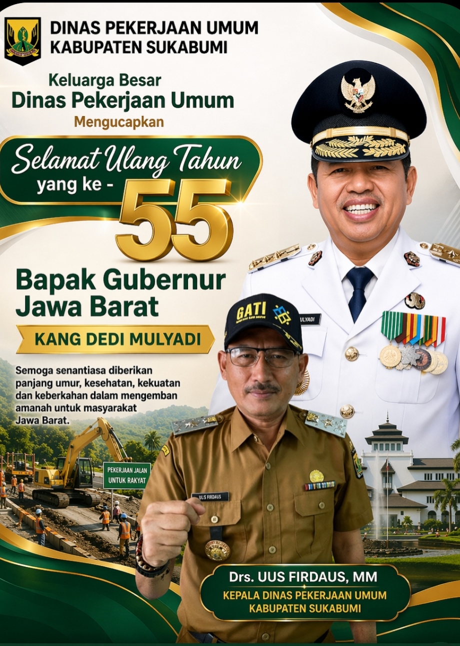 Keluarga Besar Dinas Pekerjaan Umum Kabupaten Sukabumi Mengucapkan Selamat Ulang Tahun Ke-55 Kang Dedi Mulyadi Gubernur JawabaratGARUDA SAKTI NEWS11/04/202620/04/2026SUKABUMI3232 Views Post Views: 3,232 Don't MissDesa Bojonggaling Kec. Bantargadung Sukabumi Gelar Sahriyahan Bulanan, Perkuat Ukhuwah dan Sinergi MasyarakatKlaim BPJS Ketenagakerjaan Kini Bisa Lewat Antrean Online, Layanan Lebih Cepat dan TerjadwalDinas Pekerjaan Umum Kabupaten Sukabumi Mengucapkan Selamat HUT Ke-74 KOPASSUS 16 April 2026Dinas PU Kabupaten Sukabumi Realisasikan Rehabilitasi Jalan Parungkuda–Langbow dan Ciambar–PurwasariUPTD PU Wilayah Sukabumi Gerak Cepat Tangani Pohon Tumbang di Ruas Jalan CimuncangKadis Pariwisata Sukabumi Soroti Dugaan Kecurangan Timbangan Ikan, Dinilai Rusak Citra Wisata