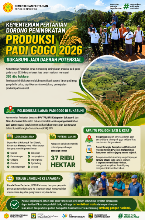 Sebagai bentuk implementasi program tersebut, Pusat Perlindungan Varietas Tanaman dan Perizinan Pertanian selaku penanggung jawab wilayah Kabupaten Sukabumi, bersama Badan Pusat Statistik Kabupaten Sukabumi dan Dinas Pertanian Kabupaten Sukabumi melaksanakan kegiatan poligonisasi lahan padi gogo.