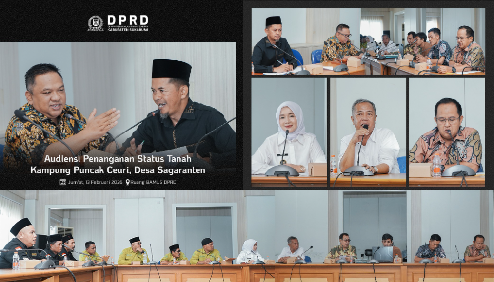 garudasaktinews.com – Sukabumi, Ketua DPRD Kabupaten Sukabumi, Budi Azhar Mutawali, didampingi Ketua Komisi I DPRD, Iwan Ridwan, memimpin audiensi terkait penyelesaian status tanah di Kampung Puncak Ceuri, Desa Sagaranten, Kecamatan Sagaranten, Jumat (13/2/2026). Kegiatan berlangsung di Ruang BAMUS DPRD Kabupaten Sukabumi dan menghasilkan sejumlah kesepakatan konkret sebagai langkah percepatan penyelesaian persoalan lahan.