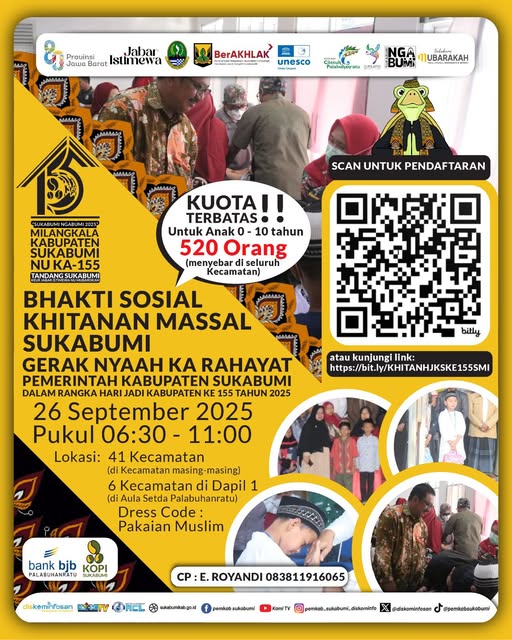 “Inilah makna sesungguhnya dari Hari Jadi Kabupaten Sukabumi, yakni menghadirkan kebahagiaan dan manfaat bagi masyarakat. Semoga anak-anak yang mengikuti khitanan massal ini tumbuh menjadi generasi yang sehat, tangguh, dan berakhlak mulia,” tuturnya.