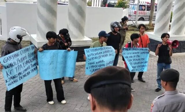 GARUDASAKTINEWS.COM-Sejumlah mahasiswa yang tergabung dalam komunitas peduli lingkungan Pandeglang melakukan aksi di depan kantor Bupati Pandeglang. Massa mengkritisi kebijakan Pemkab Pandeglang yang menjalin kerja sama dengan Pemerintah kota (Pemkot) Tangerang Selatan terkait pembuangan sampah yang hanya mengedepankan nilai komersil tanpa memikirkan dampaknya.