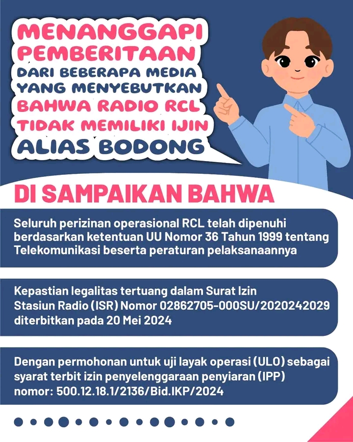 ” menanggapi berita tersebut saya sampaikan bahwa seluruh perizinan operasional RCL telah dipenuhi berdasarkan ketentuan Undang-Undang Nomor 36 Tahun 1999 tentang Telekomunikasi beserta peraturan pelaksanaannya. Kepastian legalitas tersebut tertuang dalam Surat Izin Stasiun Radio (ISR) Nomor 02862705-000SU/2020242029 yang diterbitkan pada 20 Mei 2024 oleh Direktorat Operasi Sumber Daya, Direktorat Jenderal Sumber Daya dan Perangkat Pos dan Informatika (SDPPI) Kementerian Kominfo dengan permohonan untuk uji laik operasi (ULO) sebagai syarat terbit izin penyelenggaraan penyiaran (IPP) nomor: 500.12.18.1/2136/Bid.IKP/2024″ terangnya