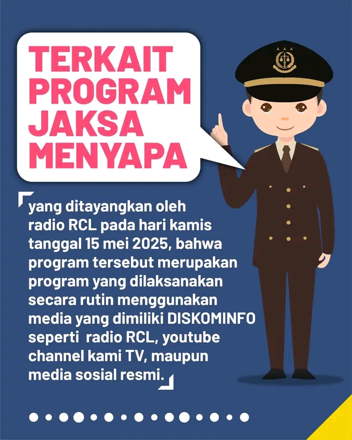 Terkait program jaksa menyapa yang ditayangkan oleh radio RCL pada hari kamis tanggl 15 mei 2025 , dapat dijelaskan bahwa program tersebut merupakan program yang dilaksanakan secara rutin menggunakan media yang dimiliki DISKOMINFO seperti radio RCL, youtube channel kami TV, maupun media sosial resmi. Program tersebut bertujuan untuk menyosialisasikan kebijakan untuk diketahui oleh public. Acara tersebut dapat diakses melalui radio streaming maupun youtube channel kami TV kapanpun oleh Masyarakat .