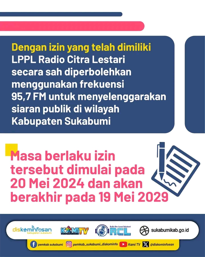 Garudasaktinews.com sukabumi- Sukabumi, 21 Mei 2025 – Dinas Komunikasi, Informatika dan Persandian Kabupaten Sukabumi menegaskan bahwa Lembaga Penyiaran Publik Lokal (LPPL) Radio Citra Lestari (RCL) yang mengudara pada frekuensi 95,7 FM telah mengantongi izin penggunaan frekuensi siaran dari Kementerian Komunikasi dan Informatika Republik Indonesia.