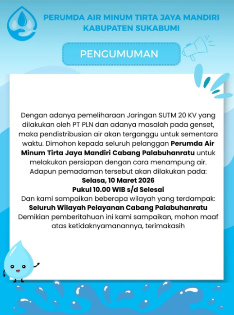 Perumda AM TJM Kabupaten Sukabumi juga menyampaikan permohonan maaf atas ketidaknyamanan yang ditimbulkan serta berharap masyarakat dapat memahami kondisi tersebut. Pihak perusahaan memastikan akan terus berupaya memaksimalkan pelayanan agar distribusi air dapat kembali normal secepatnya setelah pemeliharaan jaringan listrik selesai dilakukan.