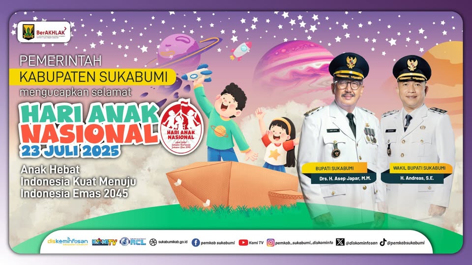 Pemerintah Kabupaten Sukabumi Mengucapkan SELAMAT HARI ANAK NASIONAL “Anak Hebat Indonesia Kuat Menuju Indonesia Emas 2025”GARUDA SAKTI NEWS22/07/202523/07/2025Berita, SUKABUMI5297 Views Pemerintah Kabupaten Sukabumi Mengucapkan SELAMAT HARI ANAK NASIONAL “Anak Hebat Indonesia Kuat Menuju Indonesia Emas 2025” Post Views: 5,297 Related PostsRatusan Atlet Ikuti Turnamen Tenis Meja Bupati Cup 2026 di CisaatAhmad Firdaus Resmi Nakhodai PC GP Ansor Kabupaten Sukabumi Periode 2025–2029Masjid Al-Walidain di Jampangtengah Resmi Digunakan, Bupati Sukabumi Ajak Warga Makmurkan MasjidBupati Sukabumi H.Asep Japar Pimpin Rapat Dinas Perdana 2026, Tekankan Koordinasi dan Penanganan BencanaBupati Sukabumi Hadiri Milad ke-8 Masjid Baiturrahman dan Letakkan Batu Pertama Pustu di GegerbitungBupati Sukabumi Dampingi Menteri Wihaji pada Temu Kader TPK dan Distribusi MBG 3B di KabandunganBupati Sukabumi H.Asep Japar Kukuhkan dan Ambil Sumpah Jabatan Manajerial Pasca Perubahan SOTK Perangkat DaerahPemkab Sukabumi Peringati Hari AIDS Sedunia, Bupati Ajak Hentikan Stigma dan Perkuat SolidaritasDon't MissDinas Perikanan Kabupaten Sukabumi Dukung Aksi Korve Bersih-bersih Jalur Utama Wilayah UtaraDinas Pariwisata Kabupaten Sukabumi Mengucapkan Selamat Hari Lahir Kartini 21 April 2026Desa Bojonggaling Kec. Bantargadung Sukabumi Gelar Sahriyahan Bulanan, Perkuat Ukhuwah dan Sinergi MasyarakatKlaim BPJS Ketenagakerjaan Kini Bisa Lewat Antrean Online, Layanan Lebih Cepat dan TerjadwalDinas Pekerjaan Umum Kabupaten Sukabumi Mengucapkan Selamat HUT Ke-74 KOPASSUS 16 April 2026Dinas PU Kabupaten Sukabumi Realisasikan Rehabilitasi Jalan Parungkuda–Langbow dan Ciambar–Purwasari