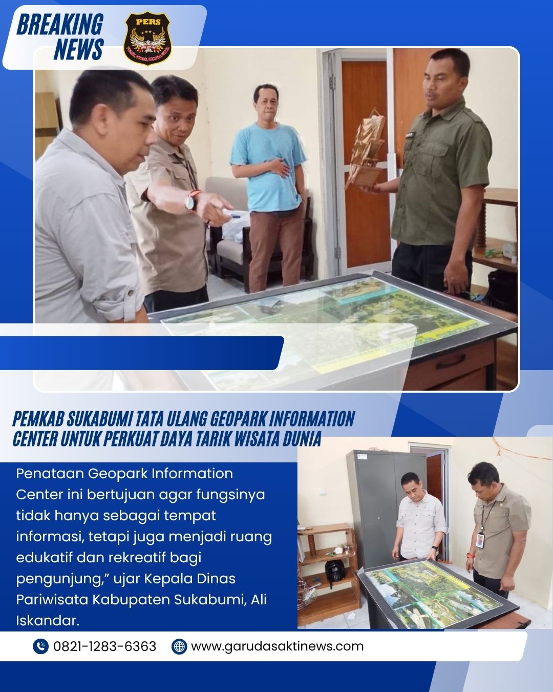 garudasaktinews.com – Sukabumi, Pemerintah Kabupaten Sukabumi tengah melakukan penataan ulang Geopark Information Center (GIC) sebagai langkah strategis memperkuat peran Sukabumi di kancah pariwisata dunia. Revitalisasi ini tidak sekadar memperindah tampilan, melainkan juga menata fungsi GIC agar menjadi simpul edukasi, rekreasi, dan promosi wisata unggulan daerah.