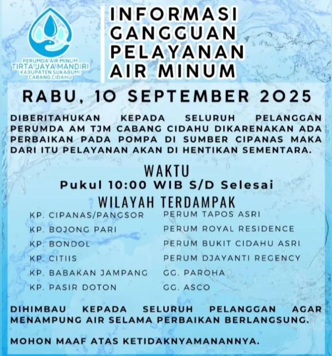 Perumda AM TJM Cabang Cidahu mengimbau seluruh pelanggan di wilayah terdampak agar menampung air secukupnya sebelum jadwal perbaikan dimulai.