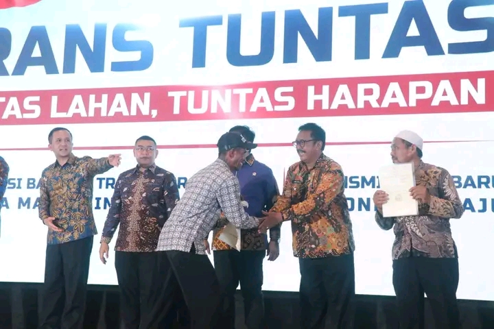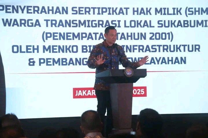 garudasaktinews.com – sukabumi, Bupati Sukabumi H. Asep Japar mendampingi Menko Bidang Infrastruktur dan Pembangunan Kewilayahan H. Agus Harimurti Yudhoyono menyerahkan sertipikat hak milik (SHM) terhadap warga transmigrasi lokal Kabupaten Sukabumi di Gedung Makarti Muktitama Kantor Kementerian Transmigrasi Jakarta, Rabu, 18 Juni 2025. Penyerahan SHM tersebut sekaligus peluncuran program Trans Tuntas oleh Kementerian Transmigrasi.