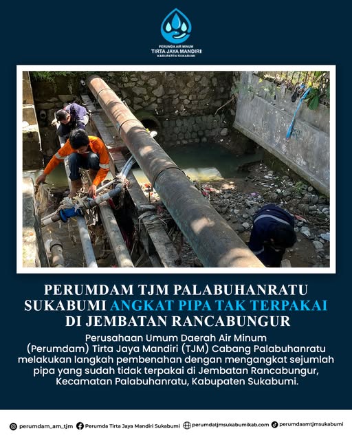 garudasaktinews.com – Sukabumi, Perusahaan Umum Daerah Air Minum (Perumdam) Tirta Jaya Mandiri (TJM) Cabang Palabuhanratu menunjukkan komitmennya mendukung program perbaikan infrastruktur dan pencegahan banjir di wilayah Kabupaten Sukabumi dengan melakukan pengangkatan pipa-pipa tidak terpakai di Jembatan Rancabungur.