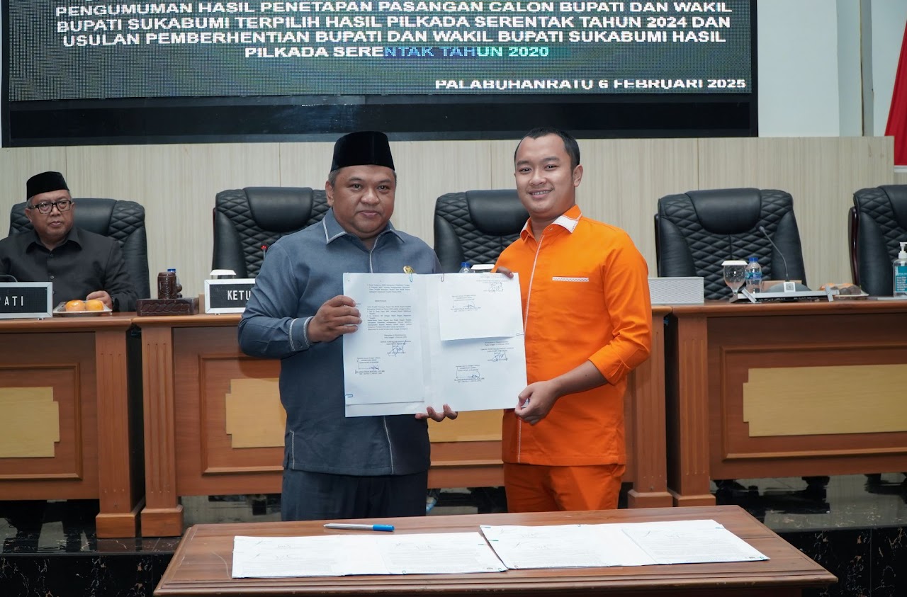 Acara pertama dalam rapat ini adalah pengumuman hasil penetapan pasangan calon terpilih, yang disampaikan oleh Ketua KPU Kabupaten Sukabumi, Kasmin Belle. Beliau mengumumkan bahwa pasangan calon yang telah ditetapkan sebagai Bupati dan Wakil Bupati terpilih untuk periode 2025-2030 adalah Drs. H. Asep Japar, MM dan H. Andreas, SE. Penetapan ini merupakan hasil dari proses pemilihan yang berlangsung secara transparan dan sesuai dengan ketentuan perundang-undangan yang berlaku.