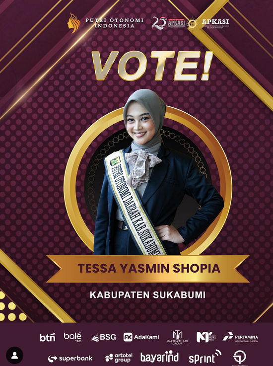 garudasaktinews.com – Sukabumi,  Mari bersatu dan tunjukkan kekuatan warga Sukabumi! Salah satu putri terbaik daerah, Teh Tessa Yasmin Shopia, saat ini tengah berjuang mengharumkan nama Kabupaten Sukabumi dalam ajang Grand Final Pemilihan Putri Otonomi Indonesia 2025.